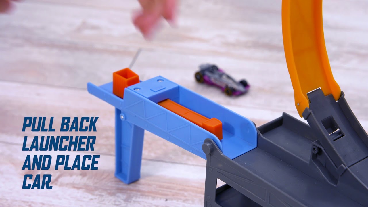 This awesome rig holds up to 18 cars, but look again, this is no ordinary hauler, this is a mobile play set, the first ever hauler with a loop! Snap the two sides of the loop in place and swing out the collapsible launcher, then pull the cab at the front to create a dramatic jump. Launch through the loop and land the jump over and over again, or add additional track for an even longer jump. The Stunt & Go transforming transporter is totally portable for stunting action anywhere, anytime! Fold the entire play set back up, load your cars in the truck bed and roll off until your next Hot Wheels stunt show. Each sold separately, subject to availability. Colors and decorations may vary.